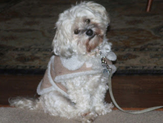 Well, I have not yet introduced a very important member of our family to date. Today is the day. Her name is “Gabby.” She is a Havanese. She doesn’t shed, and she doesn’t “sass” back. Our home is filled with men, so it’s essential that our little doggie is a girl. My men don’t mind walking her, pink leash and sylish beaded collar and all, because she is a “chick” magnent. You will also notice the very fashionable shearling coat…..fabulous!