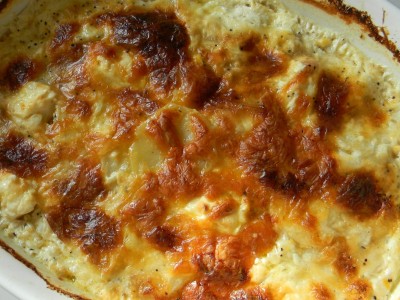 Pour the milk over the top of the potatoes and cheese moistening any flour you may see. Bake for about an hour or until the cheese is nicely browned and bubbly. If you’re serving right away, allow them to sit for 10-15 minutes.